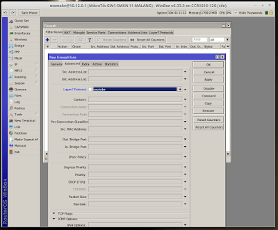 Saya akan share cara memblokir situs Youtube dengan menggunakan Mikrotik dan menggunakan fitur Firewall dan Layer 7 Protocol .